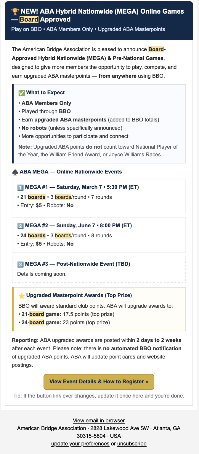 The American Bridge Association proudly launches a new era of online competition built for access, excitement, and serious masterpoint earning power.